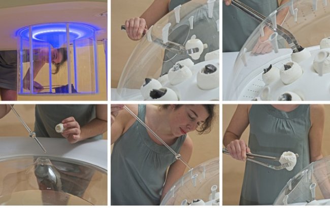 Жидкий питательный раствор с ростками гриба заливают в коконовидный сосуд и процесс переработки начинается. Каждый сосуд - это емкость, состоящая из агар-агара, морских водорослей на основе вещества, называемого "FU", и из полосок пластика, обработанных ультрафиолетовым светом для стерилизации. На протяжении нескольких недель мицелий или нитевидная и вегетативная часть гриба, медленно поглощает пластик и агар-агар, заменяя их пищевым продуктом.