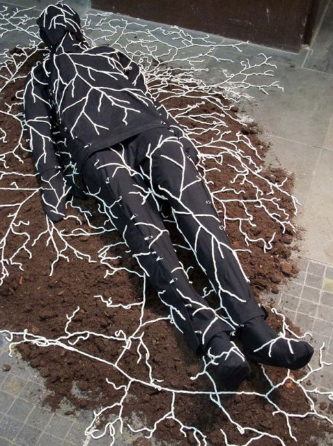 Что же касается «посмертного костюма из грибов», то он покрыт вязанной сеткой, в которую всажены грибные споры. Ветвящийся узор на нем призван имитировать рост грибного мицелия - эквивалента корней у растений.