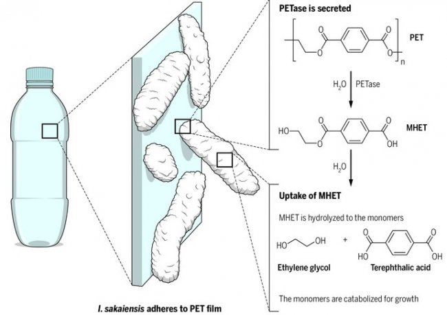 Новый вид бактерий, поедающих пластик, был обнаружен путем просеивания 250 образцов PET, собранных на заводах по переработке пластика. Об этом говорится в статье о результатах исследования, опубликованной в журнале Science. Исследовали искали свидетельства распада материала среди образцов и в конце концов обнаружили I. sakaiensis. Бактерии этого вида выделяют два фермента, расщепляющие это соединение до экологически безопасных веществ – терефталевой кислоты и этиленгликоля. Правда, происходит это не очень быстро. В исследовании говорится, что на полное переваривание небольшого куска пленки из низкокачественного полиэтилентерефталата бактерии понадобилось шесть недель. То есть, на расщепление изделий из более качественного PET потребуется еще больше времени.