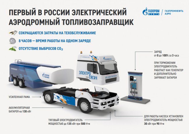 Как подчеркнули в «Газпром нефти», применение электромобиля полностью исключает выброс углекислого газа, а также позволяет на 60 % снизить уровень операционных затрат. При этом «электрический» топливозаправщик уже обслуживает в Шереметьево воздушные суда «Аэрофлота» с «Победой», а также Smartavia с Air Serbia.