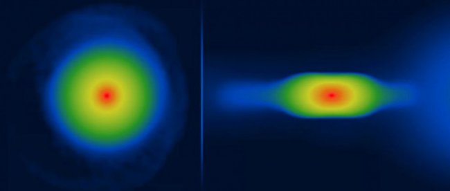 Выяснилось, что формирование планеты при определенных обстоятельствах начинается с создания пылевого диска. Он закручивается, из-за чего вещество начинает накапливаться на диске неравномерно – меньше у края и больше по центру, вблизи оси вращения. А затем и полюсов. Таким образом, некоторое время «заготовка» планеты выглядит как толстый блин, затем начинает напоминать юлу. Масса вещества в центре растет и оно становится округлым, принимает близкую к сферической форму. Впрочем, это всего лишь гипотеза, нам еще предстоит найти такую плоскую планету.