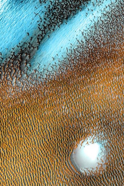 Голубым цветом программа окрасила области с низкими температурами, а золотистым – нагретые на солнце участки. Причудливая форма этих дюн считается заслугой пылевых марсианских бурь. Чем ближе к полюсу, тем больше встречается таких образований. На изображении хорошо видно, что местность очень неоднородна и наслоения дюн то и дело перемежаются глубокими впадинами, дно которых практически всегда остается в тени и не нагревается Солнцем.