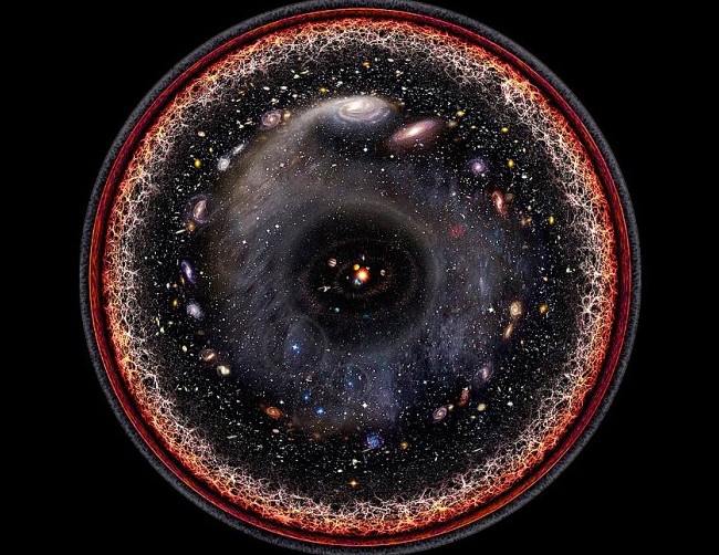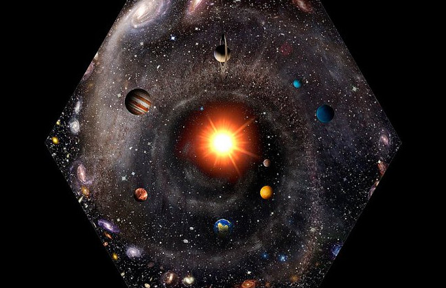 Художник Пабло Карлос Будасси, подробно изучив логарифмические карты и спутниковые изображения звездного неба, изобразил свое представление о Вселенной. На переднем плане отображено все – от Солнца до галактики Андромеды, окруженных облаком плазмы, образовавшегося миллиарды лет назад в результате Большого Взрыва.