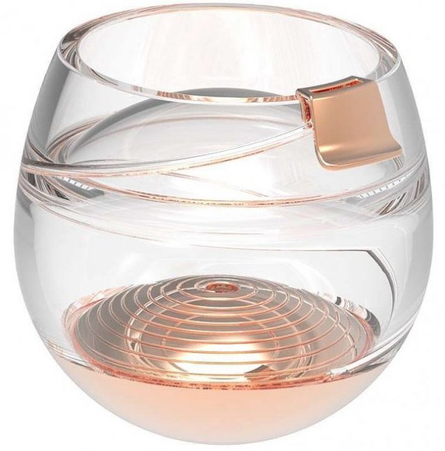 В качестве материала был выбран пластик, изготовленный на 3D-принтере. По форме бокал представляет собой герметичный полый шар. В основании бокала предусмотрен клапан для его наполнения. В нижней части сосуда находится золотая спираль, которая вместе с основанием образует поверхностное напряжение.