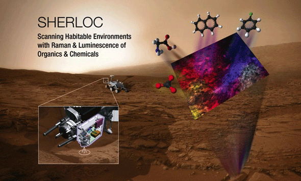 Прибор SHERLOC для сканирования в поисках обитаемой среды методом изучения спектра поверхностных проб.![]()