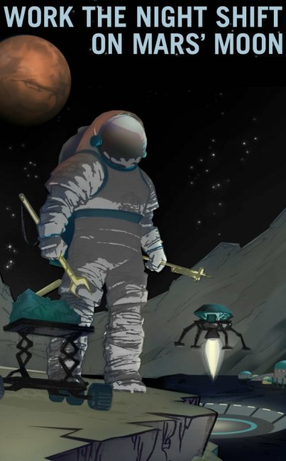 Постер "Нужны работники в ночную смену на Луне Марса". Добро пожаловать, ночные совы! Если бы вы жили на Луне Марса - на спутнике Фобос, у вас бы был офис с видом пейзажи добычи ресурсов Марса в ночном небе. Поселенцы на самом Марсе увидели бы, как Фобос восходит и садится не один, а два раза в день!