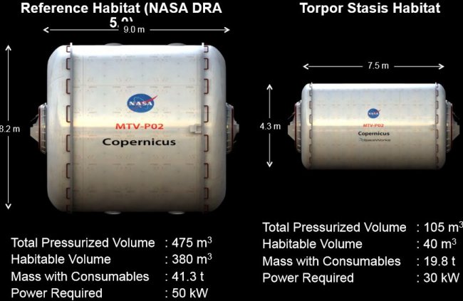 Разработку подобного проекта под названием «SPACE TORPOR» ведет финансируемая NASA компания SpaceWorks, в планы которой входит также создание на борту космического корабля вращающегося комплекса с низким уровнем гравитации. Находясь в нем путешественники смогут уменьшить негативное воздействие невесомости на опорно-двигательный аппарат и здоровье в целом.