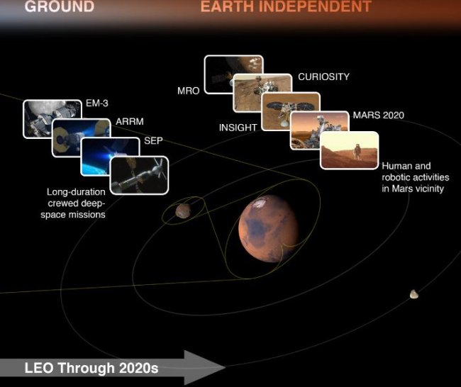 1. «Опора на Землю» (Earth Reliant). Здесь будут применяться возможности изучения условий жизни на других планетах с помощью Международной Космической Станции и земных научно-исследовательских институтов. Уже сейчас ученые NASA совместно с исследователями других стран разрабатывают различные системы жизнеобеспечения и технологии, которыми люди смогут воспользоваться на пути к Марсу и во время пребывания на нем.