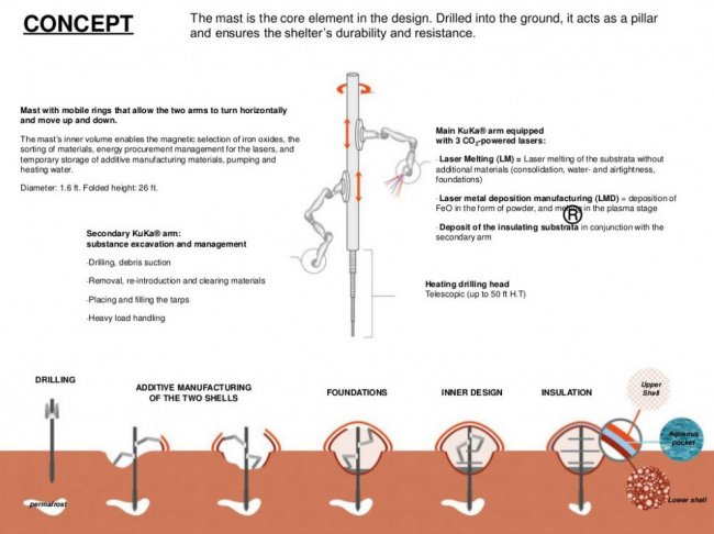Вообще-то, по правилам конкурса NASA, к участию в нем допускались только команды из США, однако французскую дизайн-студию Fabulous это не остановило, и она все-таки представляла свой концепт. Построить пригодное для жизни человека на Марсе жилище, по их идее, должен робот, который сможет зарываться в марсианскую почву и извлекать из нее металлы и другие строительные материалы. Добытое железо затем будет использовано для 3D-печати купольных сооружений, состоящих из нескольких радов наслоений, которые будет разделяться слоем воды, получаемой также с поверхности Марса.