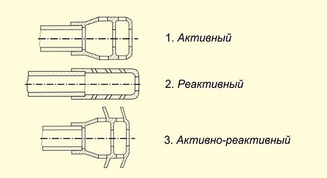 Дульный тормоз с активным действием. В таких устройствах давление пороховых газов приходится на специальную мембрану, размещенную на определенном расстоянии от ствола, а отверстия направлены под прямым углом вправо и влево. Широко применяется в стрелковом оружии и артиллерии.- Дульный тормоз с реактивным действием. Такой вид имеет отверстия с небольшим углом наклона. Данное решение более результативно компенсирует отдачу, однако выходящий газ направляется на стрелка, что может вызвать для него определенные проблемы при стрельбе очередями в помещении. В основном применяется в длинноствольных снайперских винтовках.