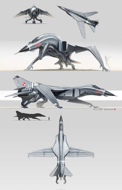 Так гордость нашей российской авиации МиГ-23, Су-33, Су-34 и перспективный «Беркут» — Су-47 с обратной стреловидностью чем-то напоминают хищных доисторических птеродактилей с когтистыми лапами вместо шасси.