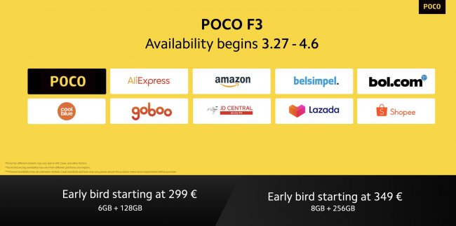 • POCO F3 6/128 ГБ — 299 евро (потом 349 евро)