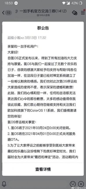 Пользователь форума XDA Developers hikari_calyx обнаружил на просторах интернета скриншот сообщения OnePlus из официальной группы в мессенджере QQ. В сообщении говорится, что компания прекращает разработку HydrogenOS. Сайт оболочки в Китае закроют уже 24 марта, а сервера OTA — 1 апреля. После этого разработчики планируют перевести устройства на интерфейс материнской компании OPPO ColorOS. Также смартфоны OnePlus начнут продавать через OPPO Store в Китае.