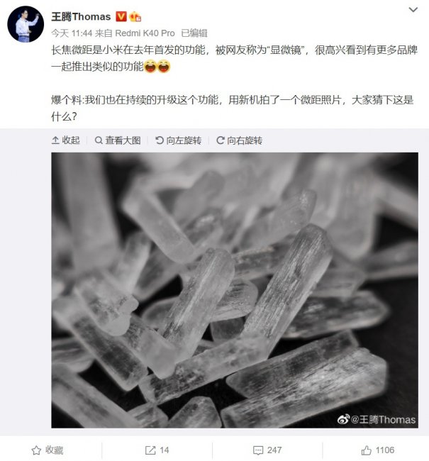 Более того, директор по новым продуктам Xiaomi Ван Тенг Томас (Wang Teng Thomas) опубликовал в соцсетях снимок, сделанный камерой этого смартфона. На нем с помощью макрообъектива можно рассмотреть вблизи кристаллы глутамата натрия.