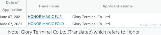Согласно изданию DealnTech, производитель зарегистрировал в начале этого месяца торговые знаки Honor Magic Fold и Honor Magic Flip в офисе Национального управления интеллектуальной собственности Китая. С большой долей вероятности, именно так будут называться новинки.