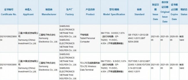 Wi-Fi и LTE-версию устройства заметили в базе данных китайского агентства 3C с номерами SM-T730 и SM-T735. Согласно отчёту, обе модели будут поддерживать быструю зарядки на 44 Вт. К сожалению в комплекте ждать такой мощный блок питания не стоит. Планшет, если верить слухам, оснастят зарядкой на 15 Вт.