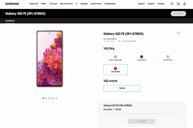 Аппарат появился на шведском сайте Samsung с номером модели SM-G780G, в четырёх расцветках и пока в одной модификации памяти 6/128 ГБ. Ценника смартфона на сайте ещё нет, но если верить изданию WinFuture, за новинку попросят в Германии 600 евро. В других европейских странах стоимость может немного отличаться.