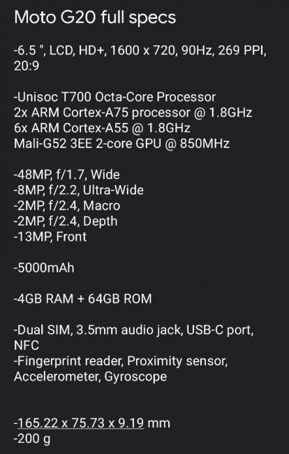 Речь идёт о модели Moto G20. Аппарат получит пластиковый корпус с двумя расцветками и его оснастят 6.5-дюймовой LCD-панелью с разрешением HD+ и частотой обновления 90 Гц. Новинка, согласно утечке, будет работать на новом процессоре Unisoc T700. Ему приписывают два ядра Cortex-A75 с частотой 1.8 ГГц, шесть ядер Cortex-A55 на 1.8 ГГц и видеоускоритель Mali-G52 3EE. Чип будет поставляться в паре с 4 ГБ ОЗУ.