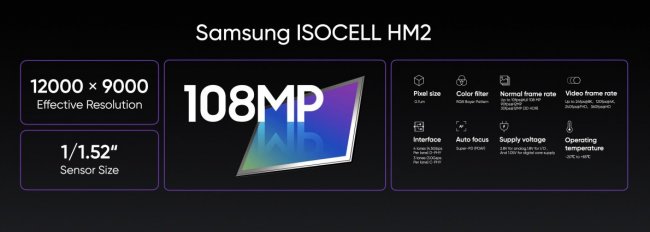 Основой камеры станет сенсор ISOCELL HM2 размером 1/1,52 дюйма с размером пикселя 0,7 мкм и автофокусом Super-PD. Он может снимать фотографии с разрешением до 12000×9000 пикселей и записывать видео до 4K при 120 кадрах в секунду. Заявлены технология объединения от 9 до 1 пикселя и 3-кратный зум без потерь.