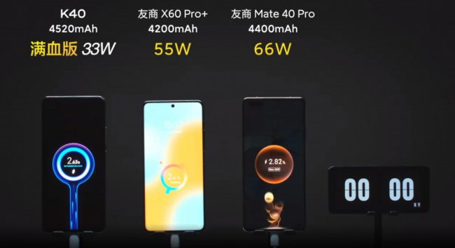 В ролике сравнили Redmi K40, Vivo X60 Pro+ иHuawei Mate 40 Pro. Для них создали одинаковые условия: включенное устройство, полная зарядка от 0% до 100%, оригинальные зарядные адаптеры.