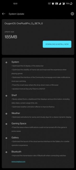 Обновление получило номер OxygenOS Open Beta 6. Прошивка весит 185 МБ и содержит январский патч безопасности, а также множество улучшений и оптимизаций. Например, разработчики оптимизировали интерфейс статус-бара, улучшили анимацию погоды, а также Bluetooth-соединение для работы смарт-часов. Кроме этого, в системе исправили проблему с работой уведомлений в некоторых играх через Game Space и многое другое.