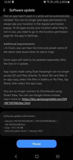 Речь идёт о бюджетнике Galaxy M21. Прошивка Android 11 для него вышла c номером сборки M215FXXU2BUAС. Кроме январского патча безопасности, в систему разработчики также добавили фирменную оболочку One UI 3.0 со всеми её особенностями. Полный список изменений можно прочитать по ссылке.