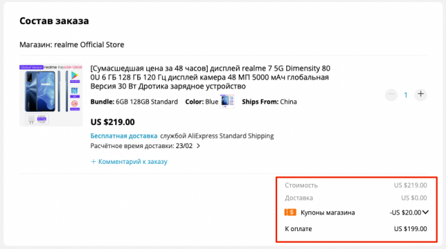 Стоит Realme 7 5G на AliExpress $219, но в течение 48 часов будет действовать купон со скидкой в $20. Для сравнения, в Европе устройство продают за 279 евро (около $340).