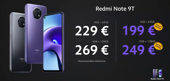 Redmi Note 9T обойдется в €229 (4/64 ГБ) и €269 (4/128 ГБ), но поначалу обещают сниженные на €20 цены. Расцветки всего две — Daybreak Purple и Nightfall Black.