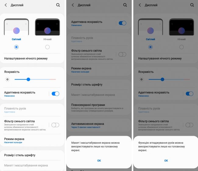 Если зайти в меню настроек экрана с внешнего дисплея, все будет точно так же, за исключением, конечно же, других пропорций. При попытке изменить параметры, которые касаются только основного экрана, появятся соответствующие всплывающие сообщения.