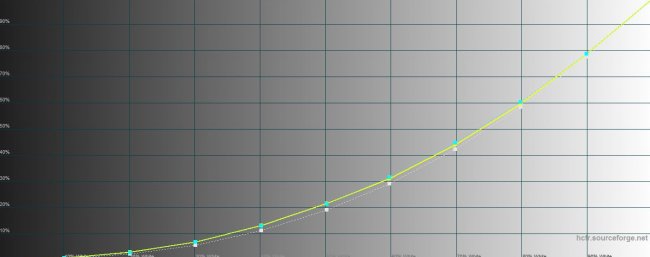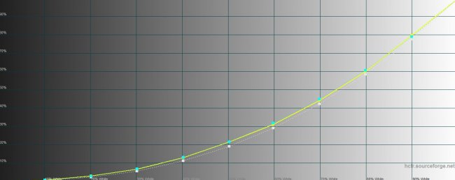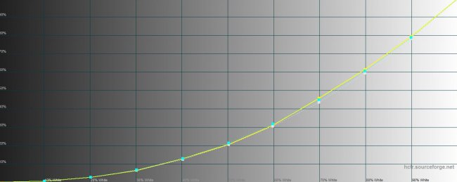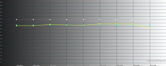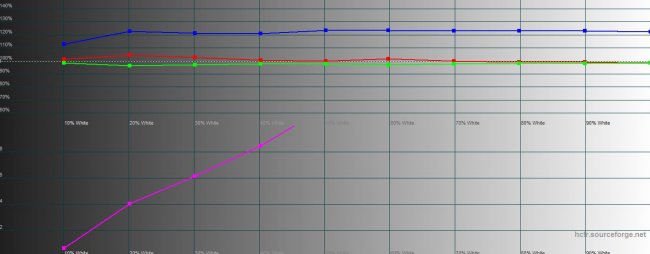 Наконец, последний тест показывает, что цветовой охват основного дисплея в режиме насыщенной цветности превышает цветовой охват sRGB (особенно в синей и зеленой части спектра), а цветовая температура показывает три разных уровня в темных, средних и светлых тонах градиента, то есть страдают светлые цвета изображения, отображающиеся чуть ярче, чем стоило бы. Зато уровень синего повышен не так сильно, как у внешнего дисплея.