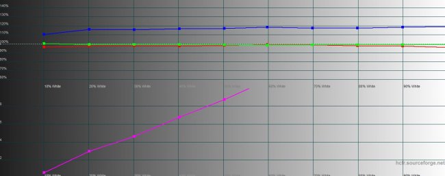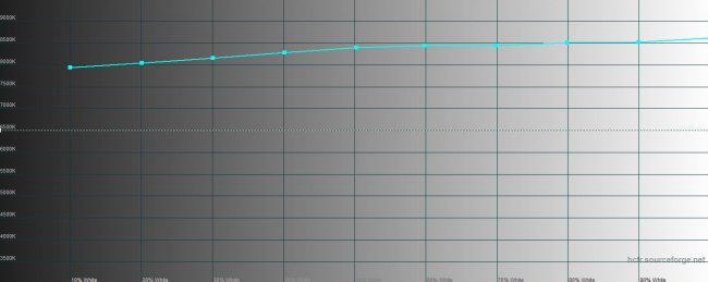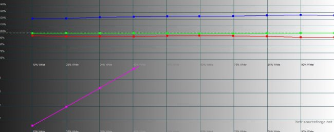 У основного дисплея ситуация, в общих чертах, повторяется. С той лишь разницей, что цветовой охват не дотягивает до цветового пространства sRGB в красном, но так же превышает его, как и внешний дисплей, в зеленом. Цветовая температура уже не так сильно скачет в темных тонах, а яркость синего превышает идеальный показатель за исключением темной части градиента, где она почти в норме.