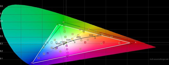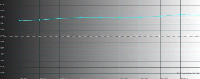 Цветовой охват экрана в этом режиме чуть превышает цветовое пространство sRGB в зеленом цвете, который выглядит ярче, чем хотелось бы. Цветоовая температура стабильно повышенная, но чуть проседает в темных тонах, то есть более светлые участки уходят сильнее в холодную часть спектра. График цветовых составляющих показывает повышенный синий цвет, характерный для всех OLED-экранов.