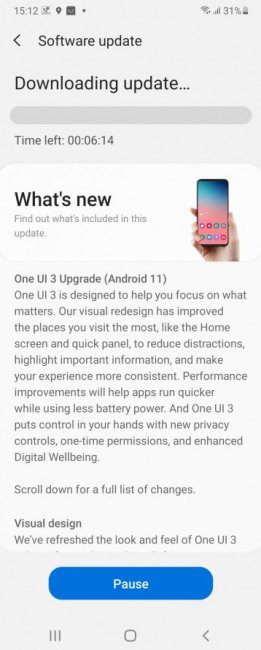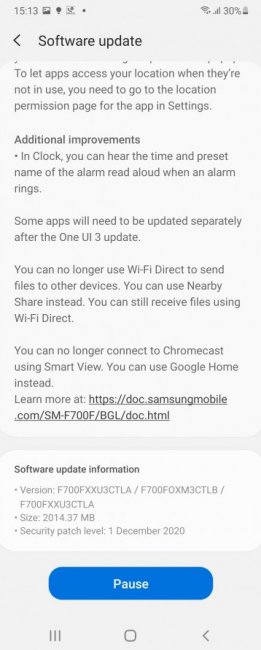 Обновление вышло с номером сборки F700FxXx3CTLx и весит 2 ГБ. В систему добавили декабрьский патч безопасности, а также новую фирменную оболочку One UI 3.0 со всеми особенностями: обновлённый интерфейс и настройки, расширенные функции режима Always-On Display, виджет мультимедиа в шторке уведомлений и многое другое.