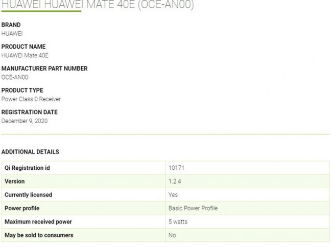 По слухам, это устройство получит название Mate 40E. Аппарат с кодовым обозначением OCE-AN00 уже прошел сертификацию Wireless Power Consortium (WPC) и Китайского центра сертификации телекоммуникационного оборудования (TENAA).