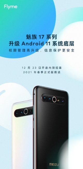 Обновление пока что анонсировали для актуальных флагманских устройств Meizu 17 и Meizu 17 Pro. Программу бета-тестирования для них выпустят 23 декабря. В начале 2021 году выйдет первая тестовая сборка. Что касается стабильной версии ПО, то её, к сожалению, не стоит ждать раньше весны. Срок долгий, но это немного быстрее, чем было с обновлением Android 10. Тогда компания начала обновлять свои устройства в конце мая.