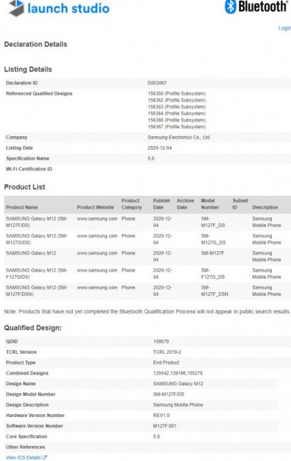 В базе данных сертификационного ведомства есть сразу 5 различных моделей Galaxy M12 — SM-M127F_DS, SM-M127G_DS, SM-M127F, SM-M127F_DSN и SM-F127G_DS. Можно подумать, что последний — это Galaxy F12, но это не так, поскольку он упоминается как Galaxy M12. Хотя, по слухам, Galaxy F12 и Galaxy M12 — это одна и та же модель.
