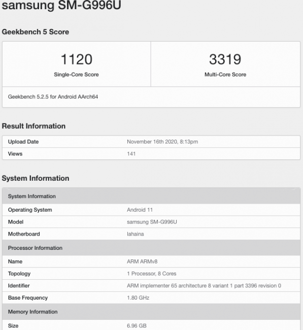 Речь идёт о Galaxy S21+. Аппарат прошёл тестирование с номером модели SM-G996U. Утечка подтверждает предыдущую информацию о новинке. Смартфон, как и ожидалось, оснастят восьмиядерным процессором Lahaina. Это кодовое название флагманского чипа Qualcomm Snapdragon 875, который дебютирует в начале следующего месяца на мероприятии Qualcomm Tech Summit 2020. SoC будет работать в паре с 8 ГБ ОЗУ. Также смартфон оснастят свежей версией ОС Android 11.