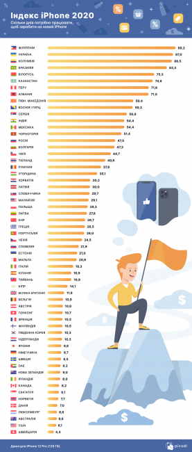Аналитики Picodi.com ранее уже рассчитывали индекс нового iPhone, а теперь представили обновленную инфографику — с Украиной и другими странами в списке.
