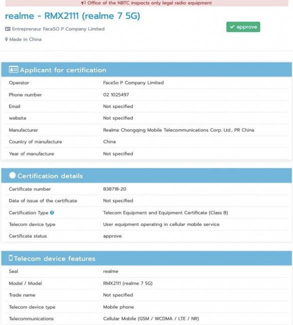 Речь идёт про 5G-модель Realme 7. Аппарат прошёл сертификацию в агентстве NBTC с номером модели RMX2111. Он, кстати, соответствует смартфону Realme V5 5G, который показали в Китае этим летом. Скорее всего, Realme 7 5G будет его глобальной версией. Следовательно, аппарат получит такие же спецификации.
