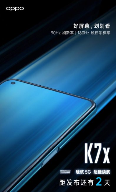 Производитель опубликовал в социальной сети Weibo тизер OPPO K7x, согласно которому аппарат оснастят дисплеем с частотой обновления 90 Гц. Кроме этого, экран будет иметь IPS-матрицу, отверстие для фронтальной камеры и частоту считывания сенсора 180 Гц. Смартфон ещё получит обычный сканер отпечатков пальцев. Его разместят на боковой грани устройства.