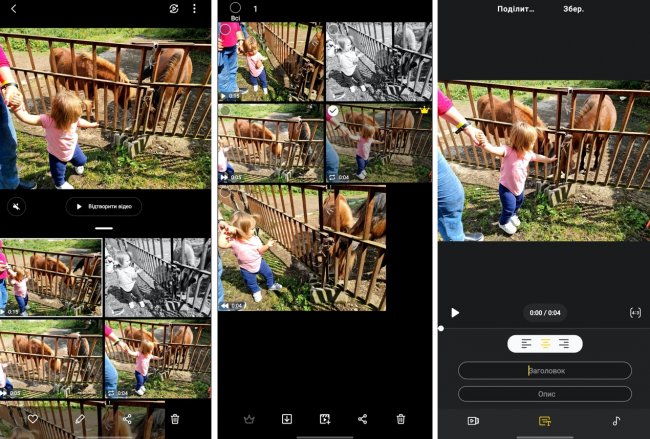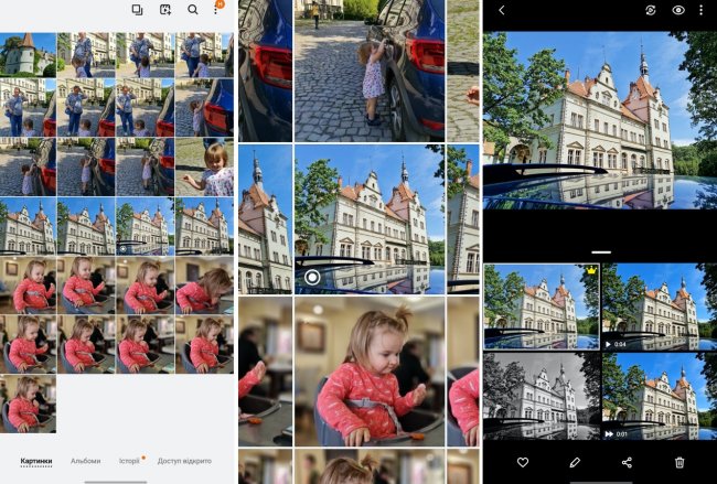 В Галерее телефона такие снимки отмечены кружочком в левом нижнем углу кадра. Если открыть этот кадра, то там развернется вся серия. При переносе серии, например, в облачный сервис, отправится как сырое видео со звуком, так и результаты работы алгоритмов. В данном случае при съемке замка Шенборнов в Закарпатье получилось два снимка с фильтрами (один из них монохромный) и короткое, в одну секунду, видео, смонтированное алгоритмами смартфона со звуковой дорожкой.