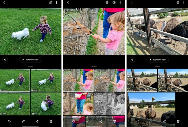 Этот режим съемки (в украинском интерфейсе он называется «Один кадр») впервые появился в Galaxy S20 и Galaxy ZFlip, но здесь в него еще добавили возможность регулировать время съемки от 5 до 15 секунд. В этом режиме камера записывает видео в разрешении 1440х1080 и одновременно делает серию снимков 4000х3000, из которых потом по собственному алгоритму нарезает несколько снимков, накладывая на них выбранные алгоритмом же фильтры и видеороликов с различными эффектами, например, ускоренное воспроизведение в обратном порядке, зацикленное видео. Как поступит алгоритм никогда неизвестно заранее, что добавляет азарта и вносит определенный фактор случайности в работе с этим режимом. Зачем же он тогда нужен? — спросите вы, если ничего нельзя контролировать? Идея заключается в том, что на съемку моментов, которые невозможно повторить, нам всегда не хватает кадров. Все, кто снимал животных или детей, прекрасно понимают о чем идет речь. Для того, чтобы «скормить» алгоритмам больше интересных данных для обработки и выбора лучших результатов, рекомендуется во время записи менять ракурсы камеры. Остановить запись можно в любой момент нажав на кнопку.
