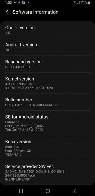 Прошивка вышла с номером сборки N960FXXU6FTJ3. В системе появилась функция Wireless DeX. Она позволяет транслировать картинку со смартфона на телевизор, который поддерживает Miracast. Также в прошивке улучшили фирменную клавиатуру Samsung Keyboard, приложение Messages и камеру, добавив возможность выбирать продолжительность записи в режиме Single Take и частоту кадров (24, 30 или 60 к/с.) в режиме Pro Video Mode.