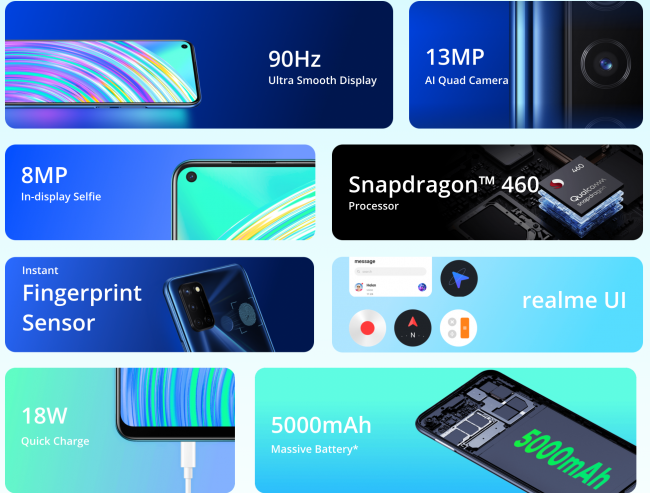 Под капотом смартфона установили 11-нанометровый процессор Snapdragon 460. Это восьмиядерный чип, который работает на максимальной частоте 1.8 ГГц. SoC поставляется в паре с 6 ГБ ОЗУ и накопителем на 128 ГБ. Также новинка может похвастаться L-образной камерой с модулями на 13 Мп + 8 Мп + 2 Мп + 2 Мп и аккумулятором на 5000 мАч с поддержкой 18-ваттной зарядки (идёт в комплекте). NFC-модуля в новинке нет. Поставляется аппарат с фирменной оболочкой Realme UI и ОС Android 10.