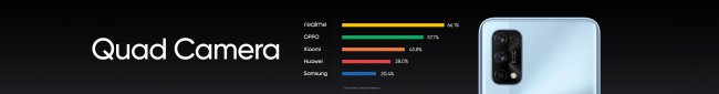 Не забыли также похвастаться успехами: у realme первый смартфон с выдвижной камерой в ценовом сегменте до $200, первый смартфон с 64-мегапиксельной Quad Camera, первый смартфон средней ценовой категории с быстрой зарядкой 65W SuperDart Charge. Кстати, у realme самая высокая доля смартфонов с 4 камерами среди всех производителей: 2 из 3 смартфонов — с квадро-камерой.