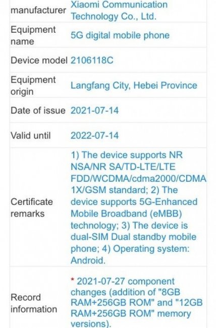 Информация показывает, что Xiaomi предложит пользователям выбор между двумя конфигурациями модели, которая зарегистрирована как M2016118C.