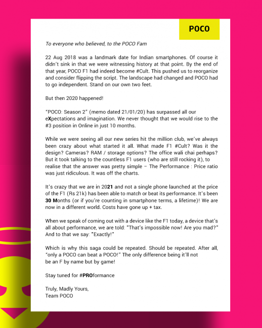 В письме представители компании вспомнили легендарный Poco F1, который предлагал отличное соотношение цены и качества. У него был топовый процессор и ценник в районе 300 долларов. С тех пор производитель в основном клонирует смартфоны Xiaomi и Redmi, но достойного народного любимца до сих пор не выпустил.