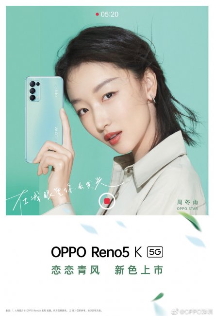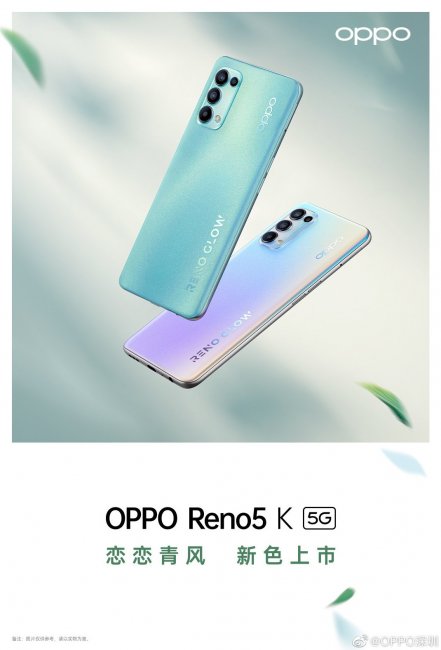 Аппарат назовут OPPO Reno 5 K. Его представят в Китае уже завтра. Новинка получит две расцветки (Green и Starry Dream) и станет копией обычного Reno 5. За исключением процессора. По слухам, вместо чипа Snapdragon 765G в аппарат установят более простой SoC Snapdragon 750G.