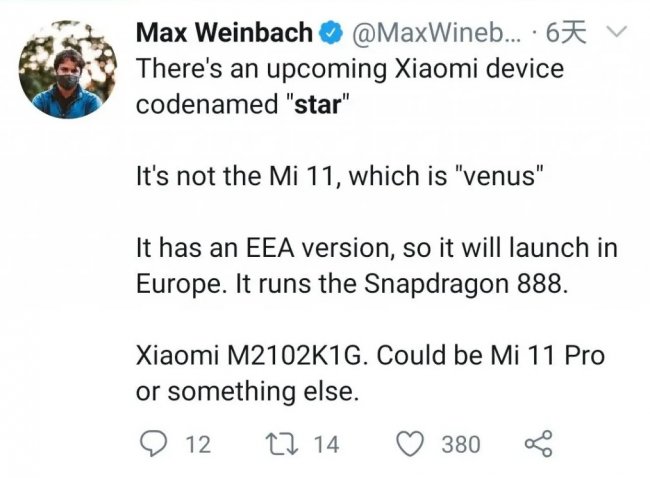 По информации инсайдера Макса Вайнбаха (Max Weinbach), это смартфон под кодовым обозначением Star и каталожным номером M2102K1G. Но это точно не Xiaomi Mi 11, так как он проходит под другим кодовым обозначением  Venus.