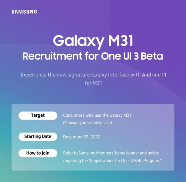 Речь идёт о бюджетнике Galaxy M31. Информация об этом появилась на официальном форуме компании. Принять участие в тесте могут пока только пользователи в Индии. В ближайшее время производитель должен расширить список стран.